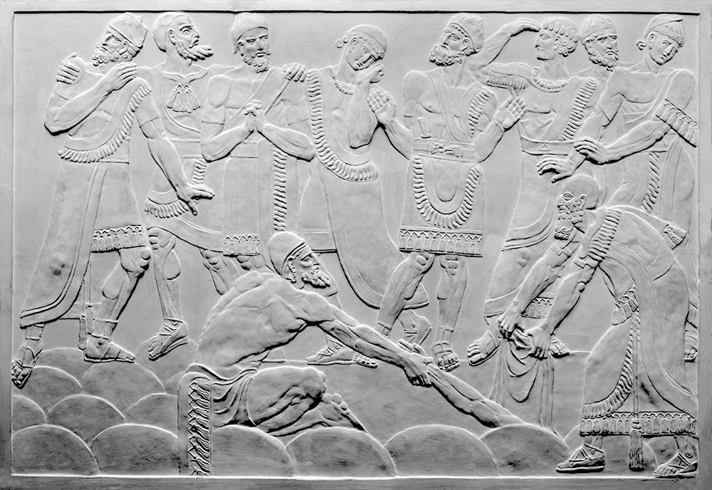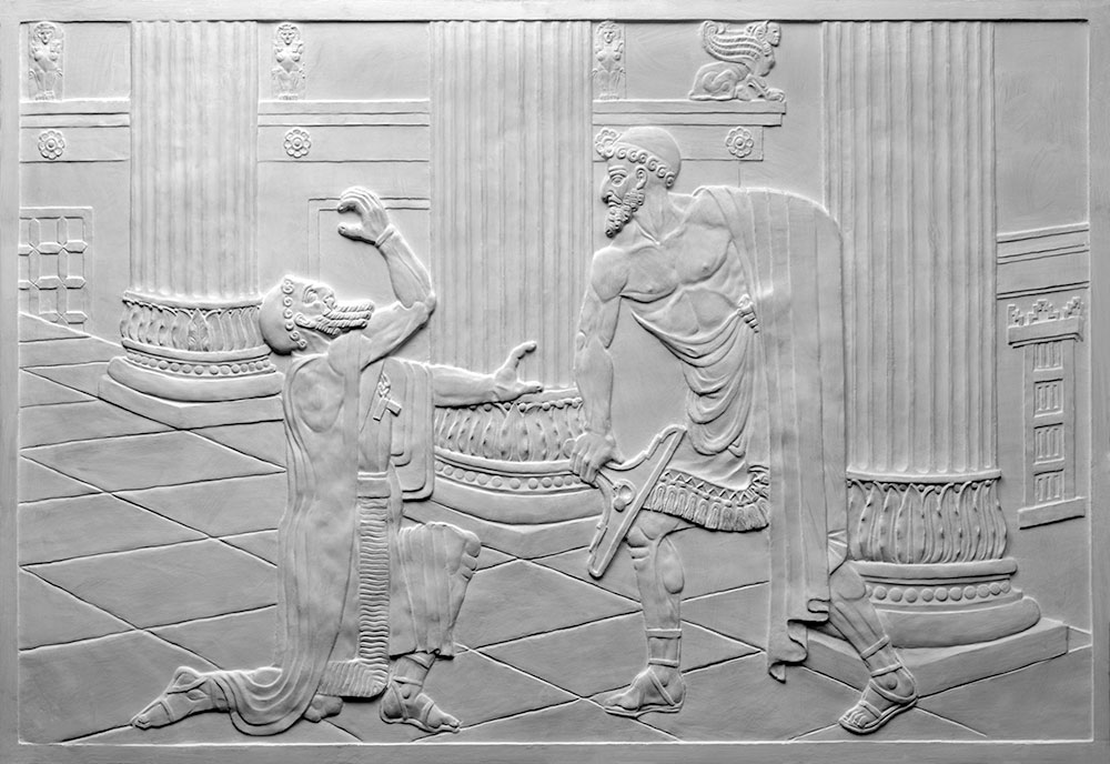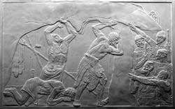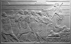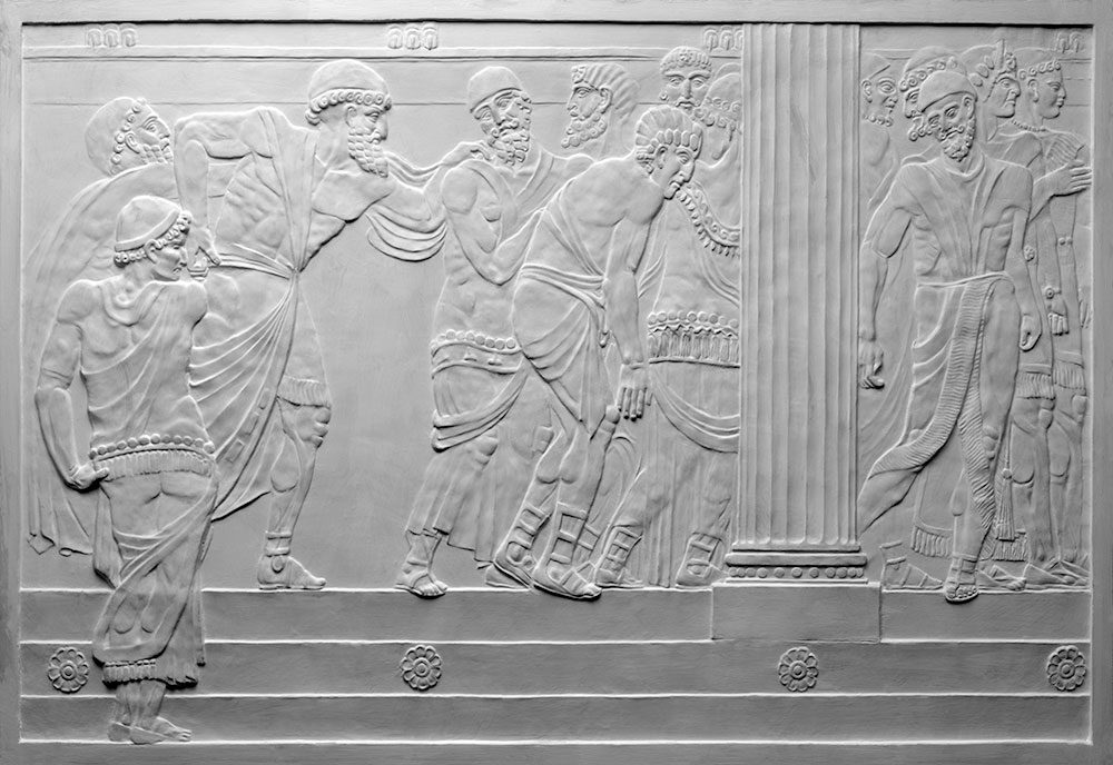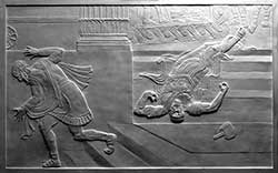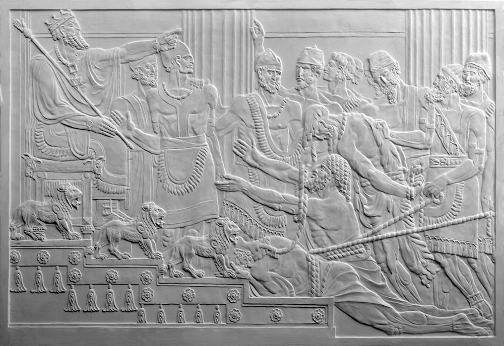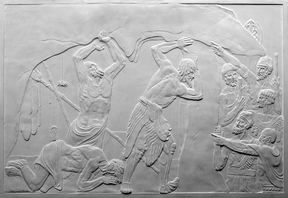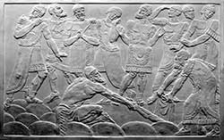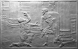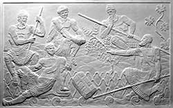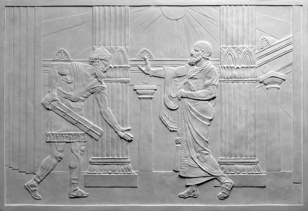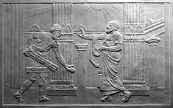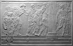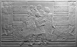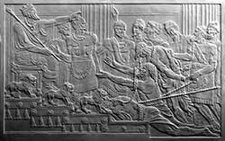 Below are our Wall Reliefs affectionally known as 'The Plaques' of which we are very proud. They are plaster reliefs measuring 4 foot 8 inches by 3 feet set on the South, West and North walls of the Temple and pictorally depict the story of the 3rd Degree. There are others around the country but we believe that our Temple is the only one with the full set of ten on display in the Temple?